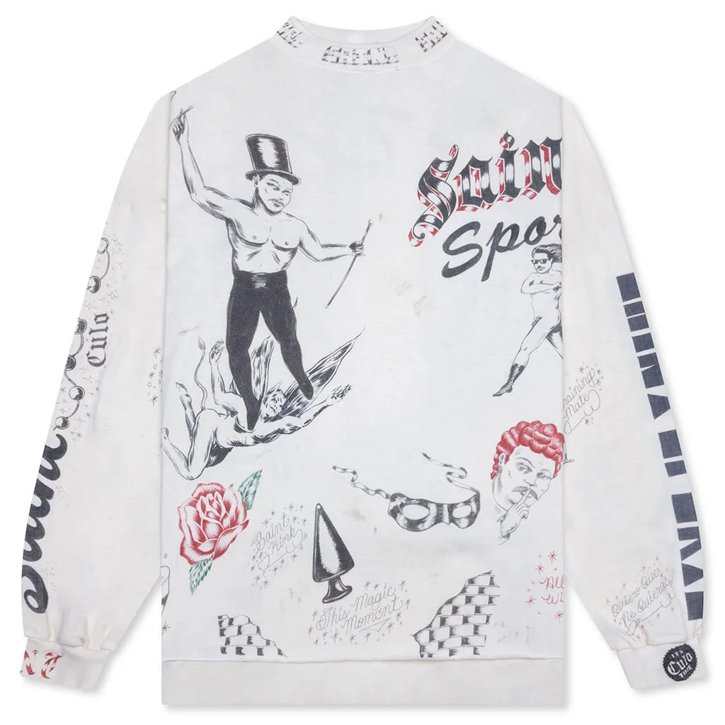 Saint Michael's artistic lens shines through in the Drawing L/S Tee. Cut from cotton with a relaxed and slightly baggy fit, this tee is adorned in sketch-like graphics that give it a raw, authentic edge. A vintage treatment and stains makes the piece feel naturally aged. The high neck collar, ribbed trims, and raw hem round out the design. - 100% Cotton - Relaxed fit - Screen-printed graphics - High neck - Ribbed collar and cuffs - Raw hem - Distressed details - Vintage treatment - Style No: SM-HR1-0000-C30