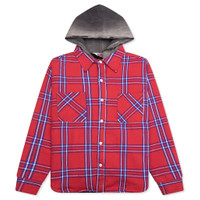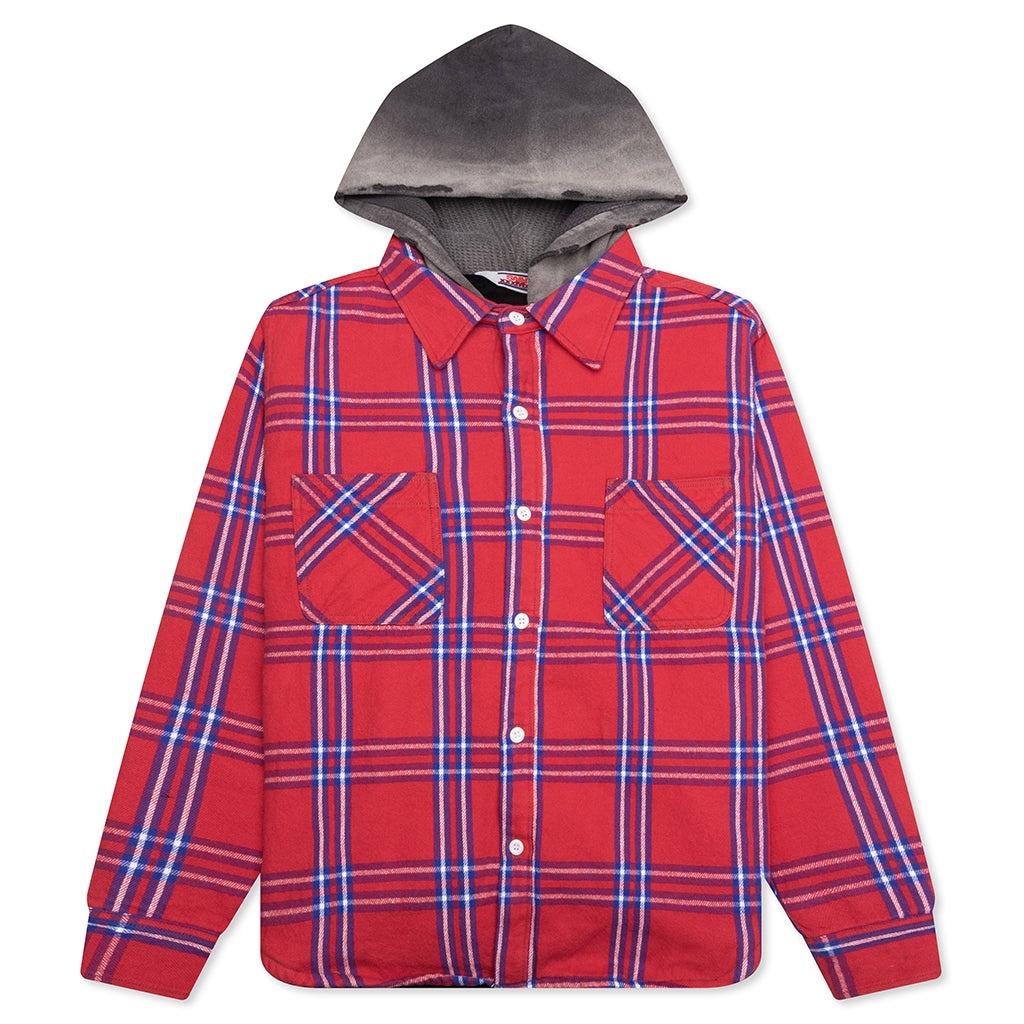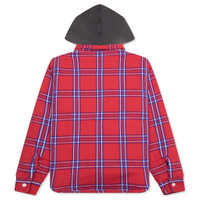 The Flannel Quilt Shirt Jacket in Red is crafted from cotton, offering a warm and versatile layer. Designed with an oversized fit, it features a thermal hood for added comfort and practicality. Chest pockets, button cuffs, and a button-up closure complete the design, blending classic flannel styling with functional details. - 100% cotton - Thermal hood - Button up closure - Chest pockets - Button cuffs - Oversized fit - Style No: SM-YS1-0000-060