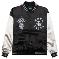 The Saint Michael x Born X Raised Satin Jacket in Black/Grey. This jacket features a rib knit collar and button fastening for a classic look. It showcases embroidered detailing and a screen-printed graphic on the back. - Rayon construction - Rib knit collar - Button fastening - Embroidered detailing - Straight hem - Screen printed graphic - Style No: SM-YS8-0000-C12