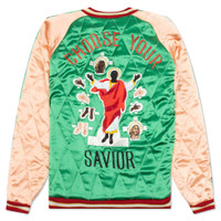 The Saint Michael x Sukajyan Reversible Jacket is an essential vintage outerwear item to keep within your rotation. Featuring an acetate construction at the front, religious patchwork makes an appearance. A full-zip closure appears alongside the side pockets. Stretchy ribbed detailing is placed at the neckline, cuffs, and hem. Additional patchwork and embroidered detailing is placed on the reverse side that is crafted from cotton. - Acetate/cotton construction - Full-zip closure - Patchwork - Embroidered branding - Ribbed neckline - Ribbed cuffs - Ribbed hem - Zip closure - Side pockets - Style No: SM-S22-0000-059-GRN