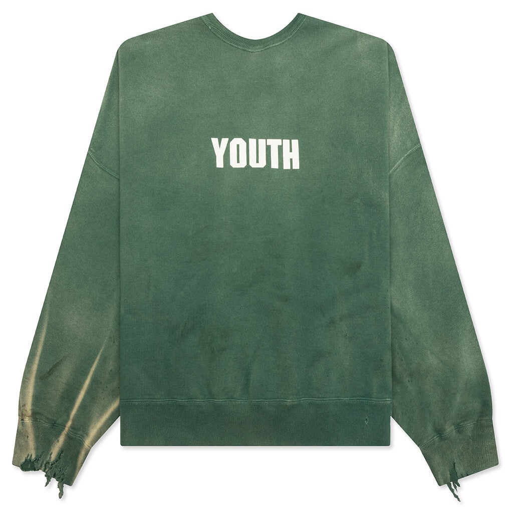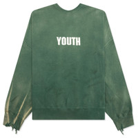 The Youth Crew Sweater in Green combines a bold aesthetic with casual comfort. Made from cotton with a jersey texture, it features a bleached effect and distressed details for a lived-in look. A logo print on the front and a slogan print on the rear add standout elements, while ribbed cuffs and hem ensure a polished fit. - 100% Cotton - Jersey texture - Bleached effect - Distressed details - Crew neck - Logo print to the front - Slogan print to the rear - Ribbed cuffs and hem - Style No: SM-YS1-0000-035