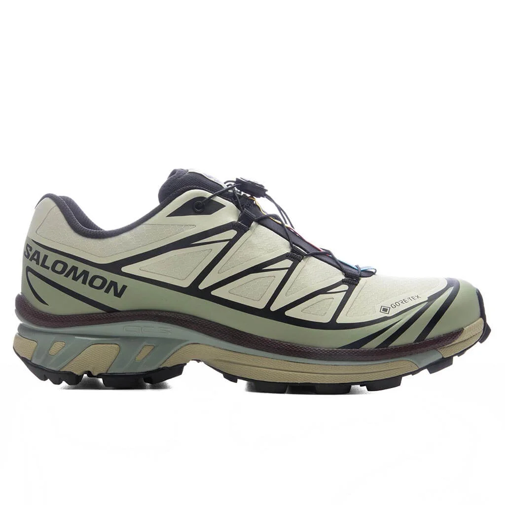 The Salomon XT-6 in Aspargus Green/Tea is engineered for durability and performance in any condition. It features a TPU upper with mesh overlays and a GORE-TEX membrane, offering waterproof protection and breathability. The Agile Chassis System ensures stability, while SensiFit technology and the Quicklace system provide a secure, comfortable fit. Equipped with a protective toe cap, OrthoLite insole, and durable rubber outsole, this design delivers reliable traction and support for both urban and outdoor adventures. THIS PRODUCT DOES NOT QUALIFY FOR DISCOUNTS OR SPECIAL PROMOTIONS. - TPU upper - Mesh overlays - GORE-TEX membrane - Agile Chassis System - Textile lining - Lace pocket - SensiFit technology - Quicklace system - OrthoLite insole - Protective toe cap - Rubber outsole - All sizes are listed in U.S. Men’s sizing unless stated otherwise - Style No: L49202200