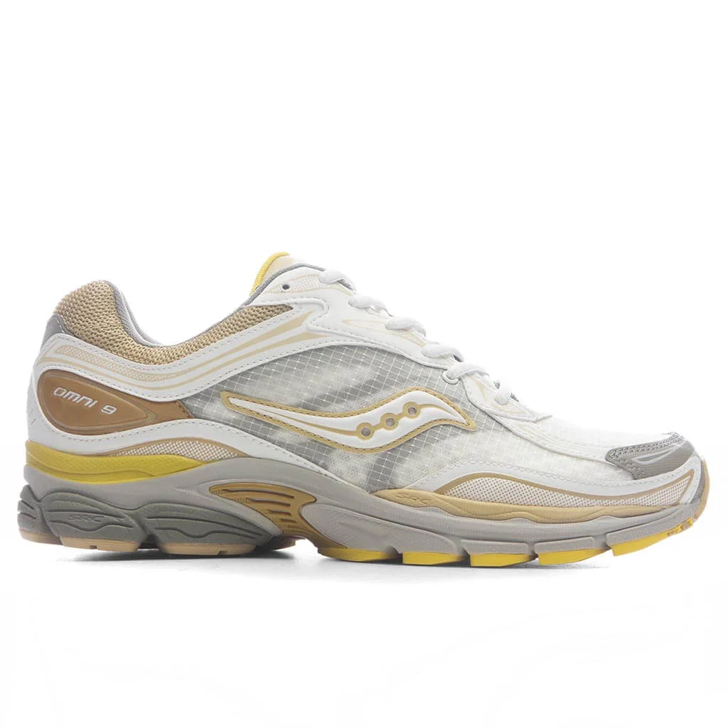 Saucony's latest version of the Progrid Omni 9 features an open-pored mesh upper, the design’s shiny synthetic overlays make an additional impression. The textile lining adds further comfort, while the technical sole unit and a Progrid outsole complete the remainder of the design. - Mesh upper - Shiny synthetic overlays - Saucony branding - Textile lining - Technical sole unit - Progrid outsole - All sizes are listed in U.S. Men’s sizing unless stated otherwise - Style no: S71004-3