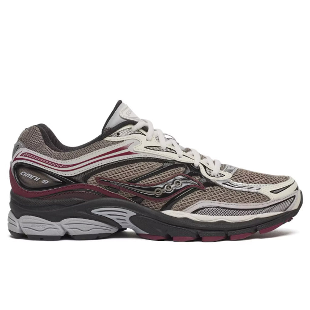The ProGrid Omni 9 'TMY' (Tomorrow, Meet Yesterday) revives Saucony’s late-2000s running icon with a blend of comfort tech and archival style, fusing the past with the future for the present. Built with an open-pored mesh upper, it offers breathability and lightweight wear. Tan overlays and reflective hits add dimension, while ProGrid cushioning delivers shock absorption underfoot. - Mesh upper - Metallic overlays - Technical sole unit - Textile lining - All sizes listed in US Men's sizes unless stated otherwise - Style no: S70832-8