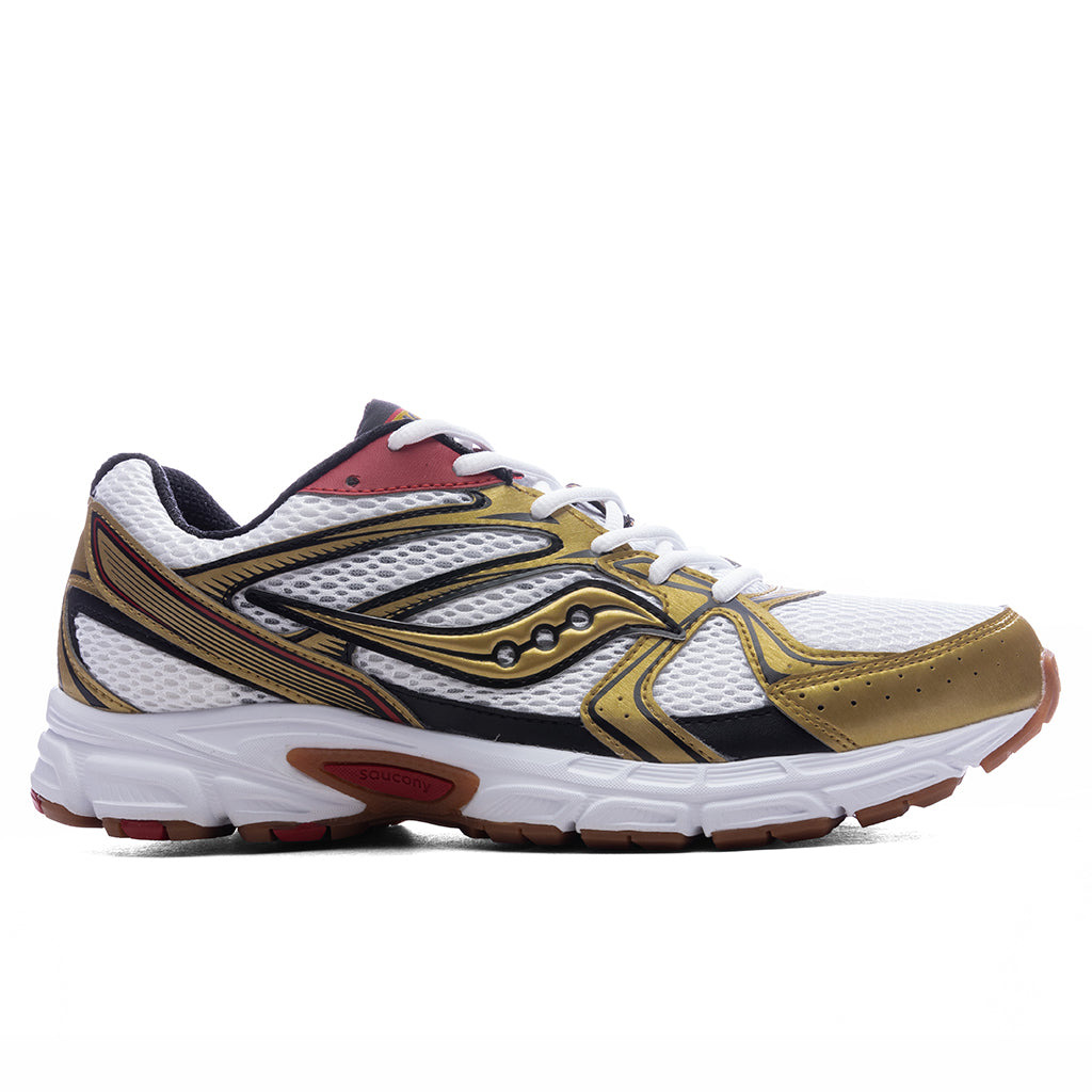 The Ride Millennium from Saucony features a breathable mesh upper with leather overlays for added support. It includes Saucony logo branding, a padded tongue, and a traditional lacing system. The shoe is equipped with a foam midsole and grid cushioning for comfort, along with a durable rubber outsole for traction. - Mesh upper - Leather overlays - Saucony logo branding - Padded tongue - Traditional lacing system - Foam midsole - Grid cushioning - Rubber outsole - All sizes are listed in US Men's sizing unless stated otherwise - Style No: S70812-74