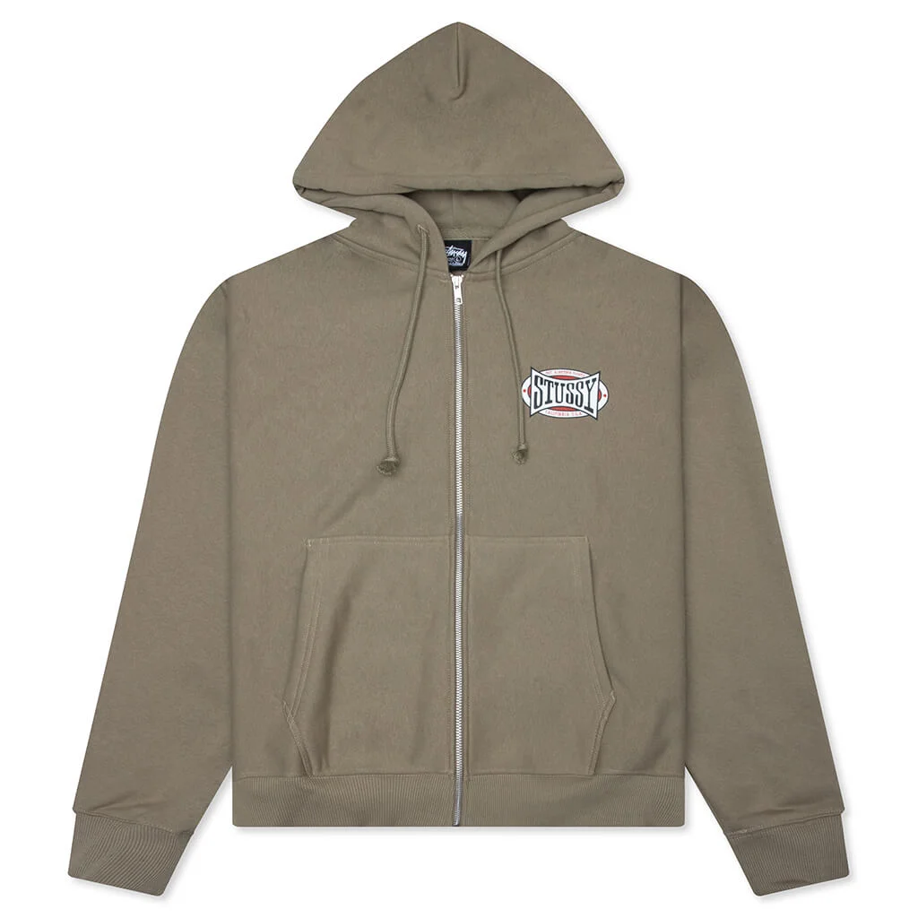Stussy presents a new cold weather essential with the Champion Oval Zip Hoodie. Crafted from a cotton-polyester blend, this heavyweight hoodie is cut to have a relaxed fit. Classic details include a full zip-front, drawcord hood, ribbed trims, and patch pockets. The look is complete with screen-printed graphics at the chest and back. - 75% Cotton, 25% Polyester - Relaxed fit - Heavyweight - Drawcord hood - YKK zip front closure - Screen-printed graphics - Ribbed cuffs and hem - Patch pockets - Style No: 1975144-ARMY