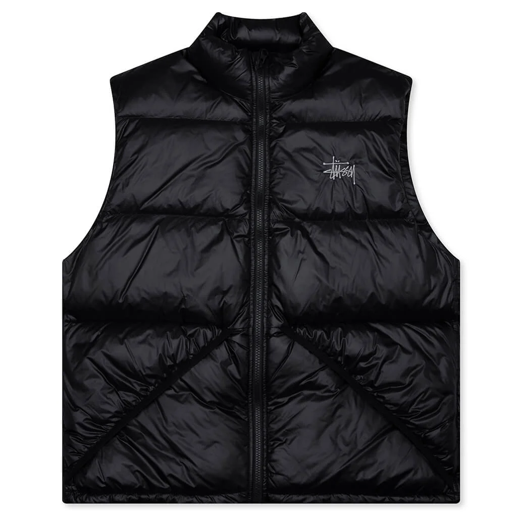 Layer up with the Micro Ripstop Down Vest from Stussy. Built with 100% nylon shell and lining, it's filled with a premium blend of 90% down and 10% feather, delivering lightweight insulation. Featuring a full-zip closure, mock neck, and shock cord hem for classic puffer vest styling. Ample storage is provided with concealed zip pockets and interior zip and mesh pockets. An embroidered Stussy logo at the chest adds the final touch. - Main: 100% Nylon - Lining: 100% Nylon - Fill: 90% Down, 10% Feather - Mock neck - YKK zip closure - Embroidered Stussy logo - Concealed zipper pockets - Interior zip and mesh pockets - Shock cord hem - Style No: 115895-BLAC