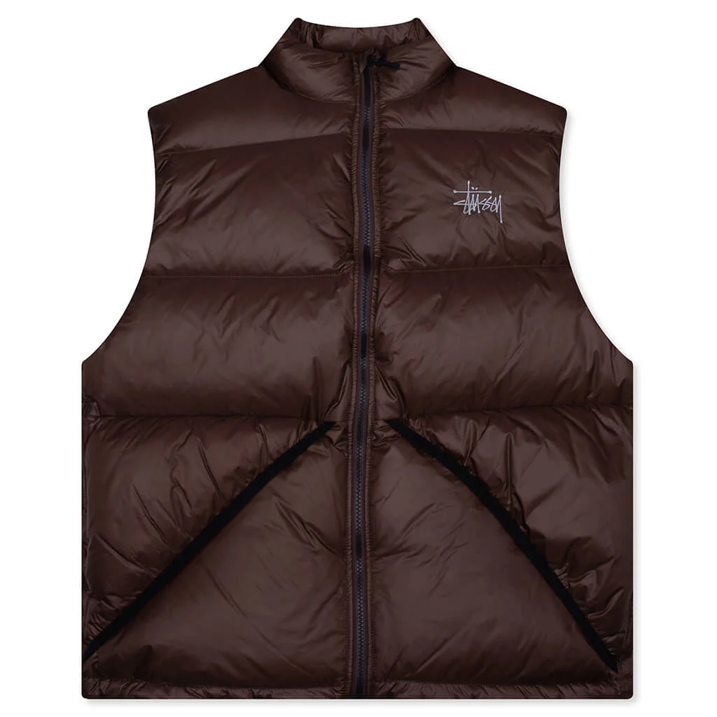 Layer up with the Micro Ripstop Down Vest from Stussy. Built with 100% nylon shell and lining, it's filled with a premium blend of 90% down and 10% feather, delivering lightweight insulation. Featuring a full-zip closure, mock neck, and shock cord hem for classic puffer vest styling. Ample storage is provided with concealed zip pockets and interior zip and mesh pockets. An embroidered Stussy logo at the chest adds the final touch. - Main: 100% Nylon - Lining: 100% Nylon - Fill: 90% Down, 10% Feather - Mock neck - YKK zip closure - Embroidered Stussy logo - Concealed zipper pockets - Interior zip and mesh pockets - Shock cord hem - Style No: 115895-BROW