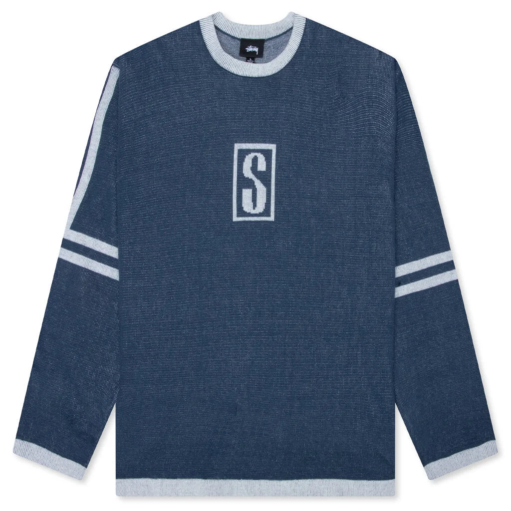 The Stussy Alpine Sweater is crafted from a cotton-wool blend, creating a luxurious and soft feel. With a relaxed fit, contrast ribbed trims at the collar and cuffs round out the design. The look is highlighted by intarsia knitted designs that ensures plush comfort. - 80% Cotton, 20% Wool - Relaxed fit - Intarsia knit designs - Crew neckline - Contrast ribbed trims - Style No: 117279-BLUE