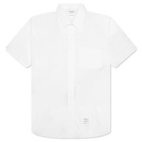 The Thom Browne Poplin Silk 4-Bar Straight Fit Shirt makes an impression on any apparel collection. The design is made for a straight fit and incorporates a mixed stripe Mogador 4-bar detail on the left sleeve. A front button closure and a button-down point collar make a statement. The chest pocket adds a functional touch. The name tag applique and signature striped grosgrain loop tab finish the rest of the design. - Cotton - Straight fit - Front button closure - Button-down point collar - Patch chest pocket - Pleated buttoned cuffs - Name tag applique - Striped grosgrain loop tab - Style No: MWS239E-E0308-100