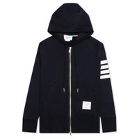 In 1997 Thom Browne worked as a salesman in Giorgio Armani’s showroom which lead to a position in the creative department for Club Monaco. Brown spent several years leading the creative development team at Club Monaco before launching his own label. What started in as a small made-to-measure-suit shop in New York City, Thom Brown clothing has grown into a global brand that now includes ready-to-wear, shirts, shoes and accessories. Pictured is the Thom Browne Classic Full Zip Hoodie in Navy. - 100% Cotton - Adjustable drawstring - 2 way zip closure - Front felt pockets - Ribbed edges - Made in Japan - Style no: MJT022H-00535-461