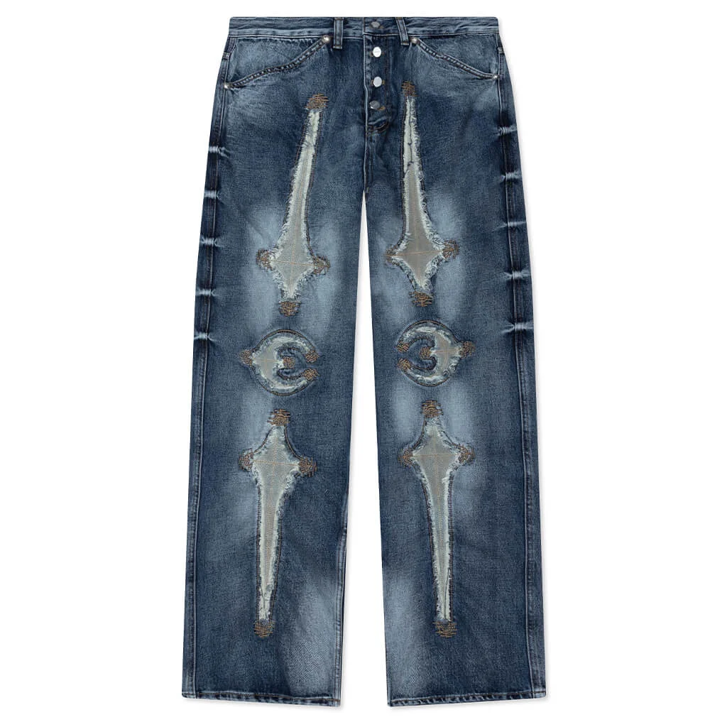 The Bone Leather Denim Pants redefines denim with Thug Club attitude. Crafted from premium cotton, the pants are treated with a washed treatment, giving them a naturally worn feel. Thug Club logos are cut out of the denim and repaired with leather patches that mimic the look of "bones", adding dimension and edge to the look. Signature branding is found through custom hardware and a leather jacron with the Thug Club emblem. - 100% Cotton - Button-fly - 4-pocket design - Leather patch graphics - Distressed details - Washed treatment - Thug Club emblem - Custom hardware - Leather jacron - Style No: TC25PT2101