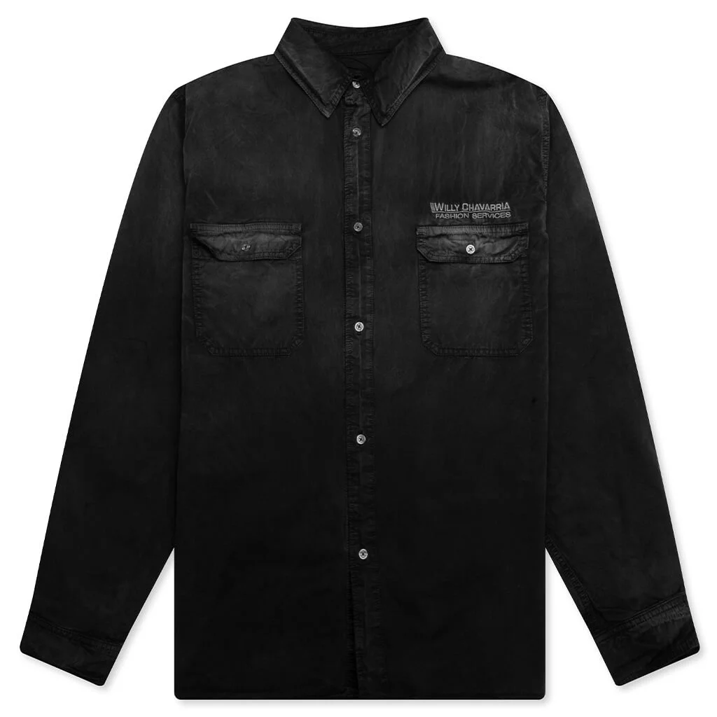 The Willy Chavarria Corcoran L/S Work Shirt is crafted from 100% cotton, showcasing a classic worn in workwear silhouette. This shirt features oversized silhouette with dropped shoulders, a point collar, a button-up front with mother of pearl buttons, and dual flap patch pockets. Finished with tonal embroidered text at the chest and a signature 'W' tab detail at the center back completed by an inverted back pleat. - 100% Cotton - Point collar - Oversized silhouette with drop shoulders - Button-up front - Dual flap patch pockets - Embroidered text - 'W' tab detail at center back - Inverted pleat at back - Worn Washed - Style No: WCSHT0026-001