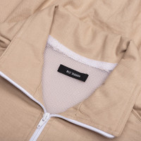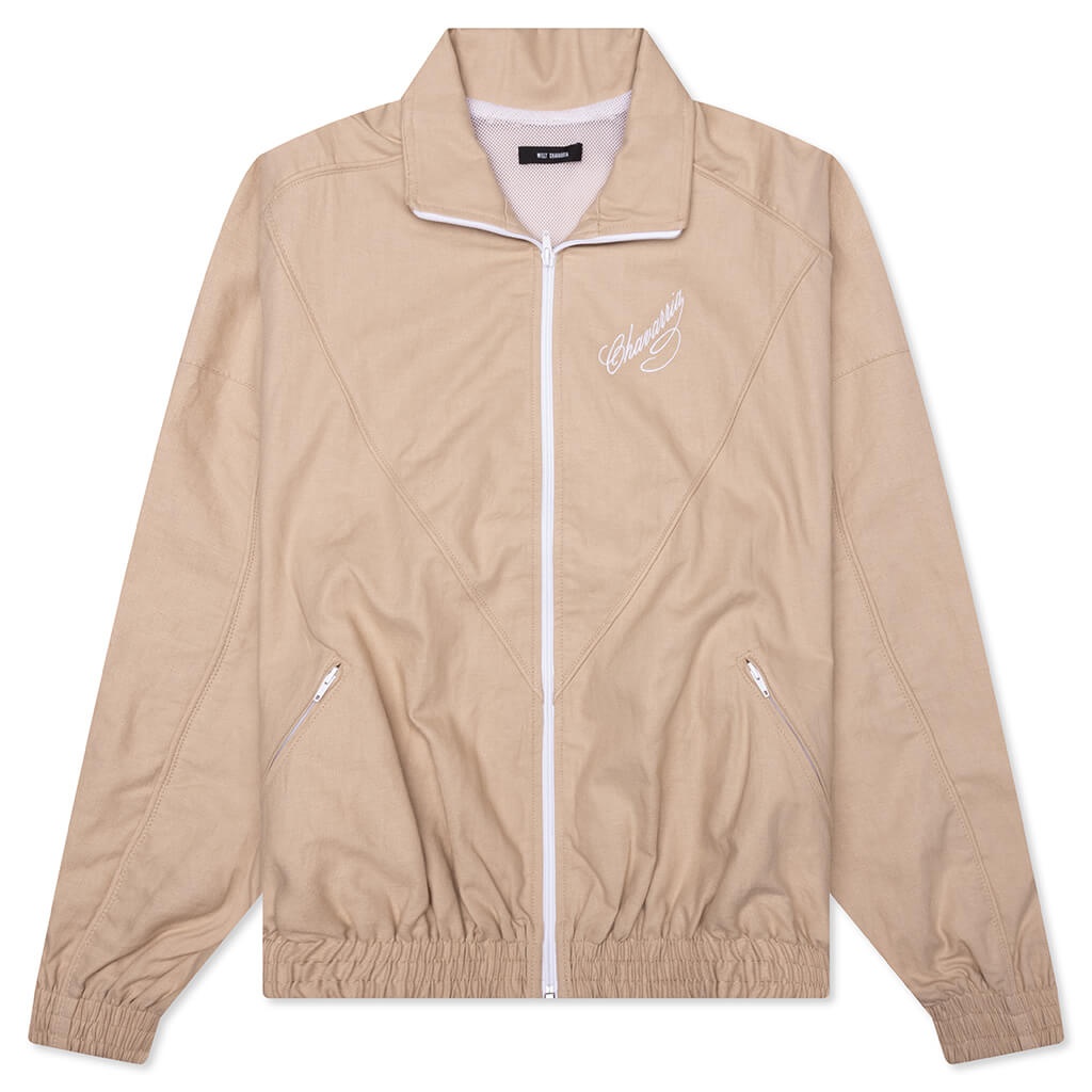 The Willy Chavarria Ruff Rider Track Jacket is crafted from a breathable 50% cotton and 50% linen blend with a 100% polyester mesh lining for added comfort. Featuring a chevron panel accented with piping, this jacket offers a structured silhouette with an elastic self-faced waistband and cuffs. Additional details include a full zip-up standing collar, two zip pockets, and an embroidered script logo on the left chest, merging sporty function with refined style. - 50% Cotton, 50% Linen - 100% Polyester mesh lining - Chevron panel with piping detail - Elastic self-faced waistband and cuffs - Full zip-up standing collar - Two zip pockets - Embroidered script logo on left chest - Style No: WCJKT0014-009