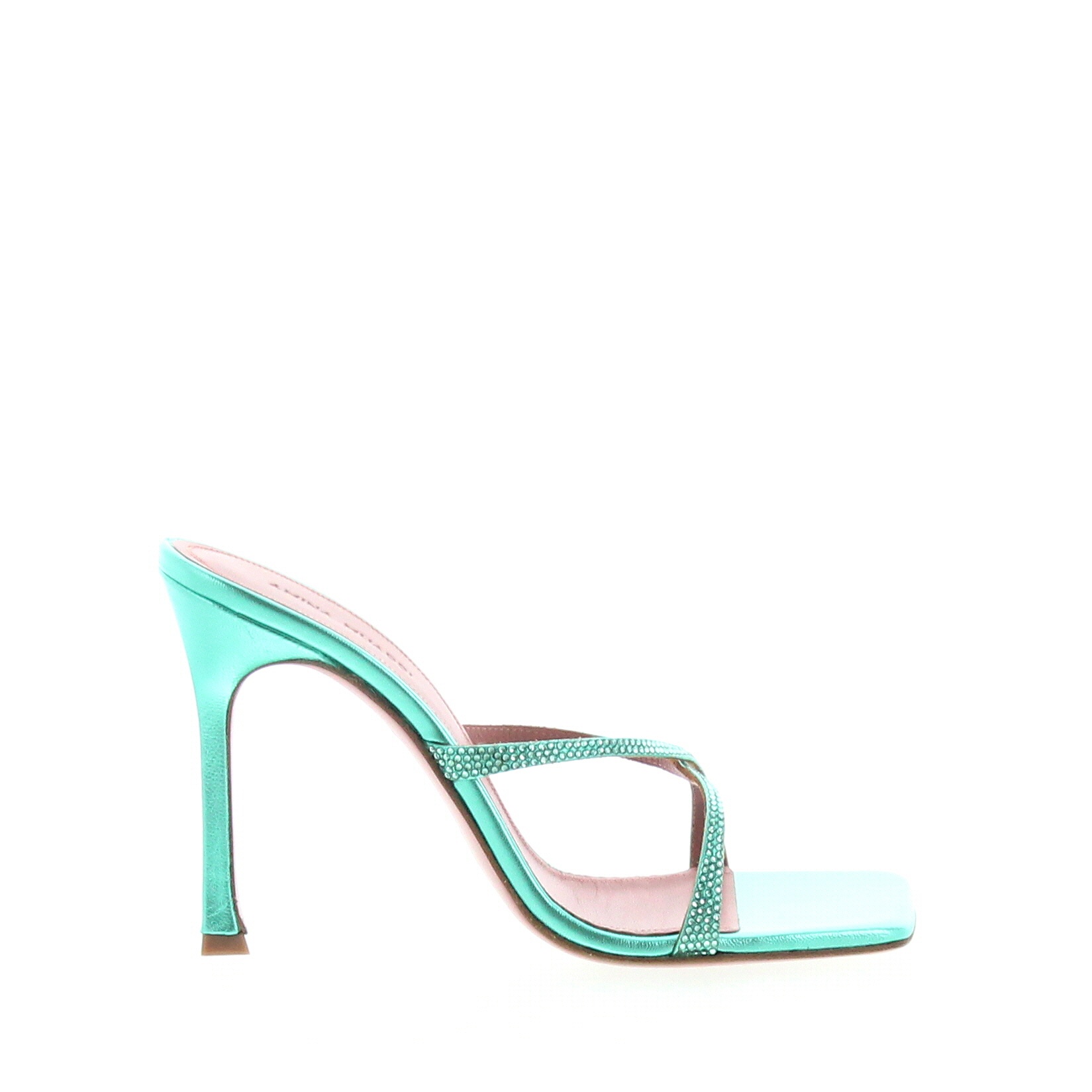 Slipper with two crossed straps embellished with crystals. Crafted in laminated Caribbean leather and matching crystals, set on a 105mm stiletto heel, square toe, leather sole with non-slip. Made in Italy.
