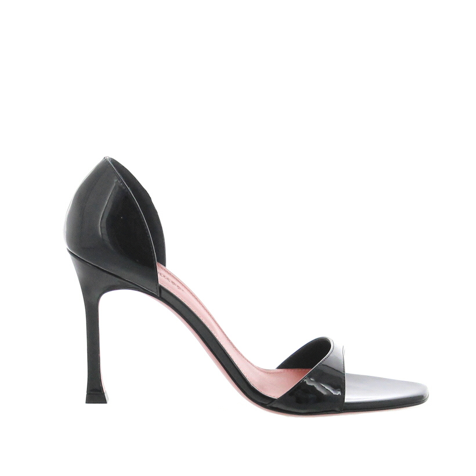 Minimalist sandal with a band on the toes and closed at the heel. Crafted in Black Patent leather and set on a 95mm heel. Made in Italy.