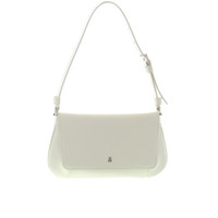Super chic new mini bag by Amina Muaddi, rigid structure in Almond-coloured brushed leather. Embellished with a small mirror inside and a flat pocket. Silver hardware. Dimensions: width 21, height 10,5 and depth 4,5cm, handle drop 18,5cm. Made in Italy.
