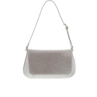 Super chic new mini bag by Amina Muaddi, rigid structure in Silver satin embellished with White crystals. Inside you find a small mirror and a flat pocket. Silver hardware. Dimensions: width 21, height 10,5 and depth 4,5cm, handle drop 18,5cm. Made in Italy.