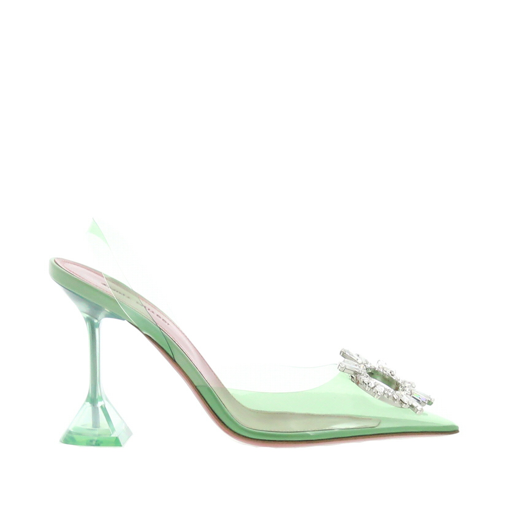 The Begum Glass slingback is set on the iconic 95mm heel by Amina Muaddi. Crafted in Mint PVC with the signature brooch. Made in Italy.