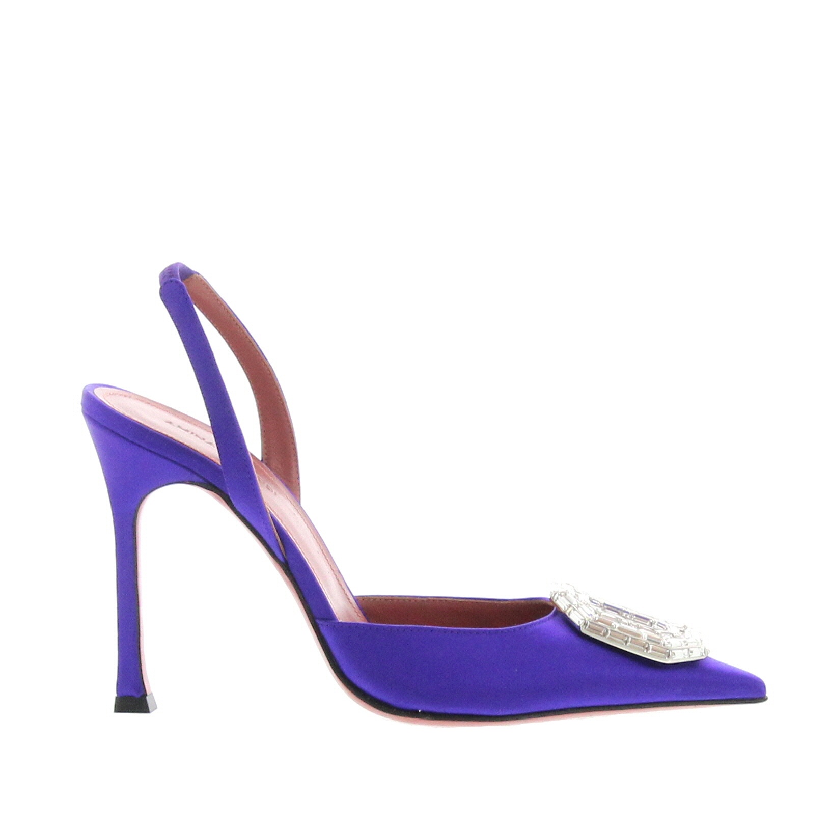 The Amina Muaddi's Camelia slingback is set on a slim 105mm heel and crafted in Purple satin. leather sole, Made in Italy.
