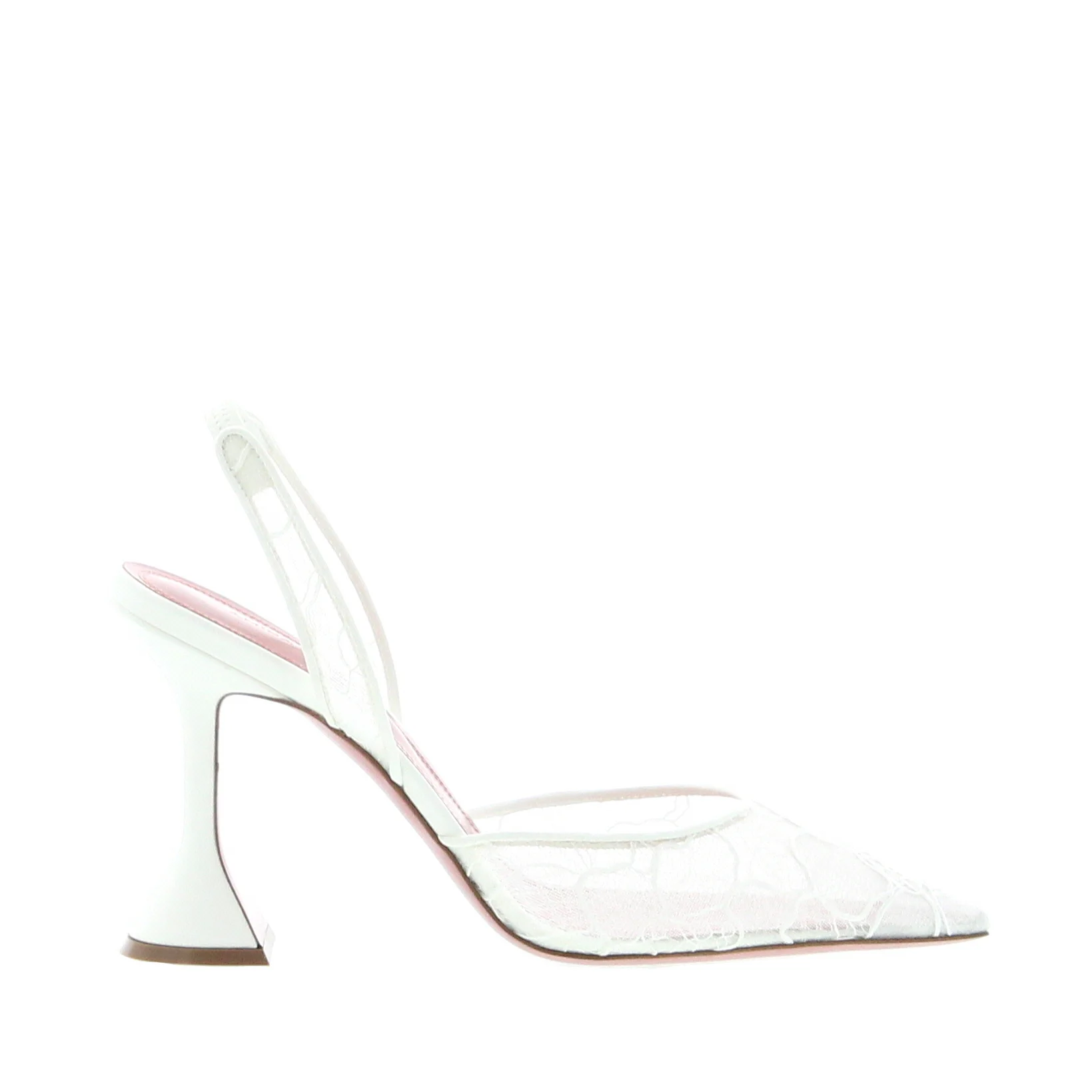Simple and stylish slingback set on the iconic 95mm heel by Amina Muaddi. Crafted in Ivory lace. Made in Italy.