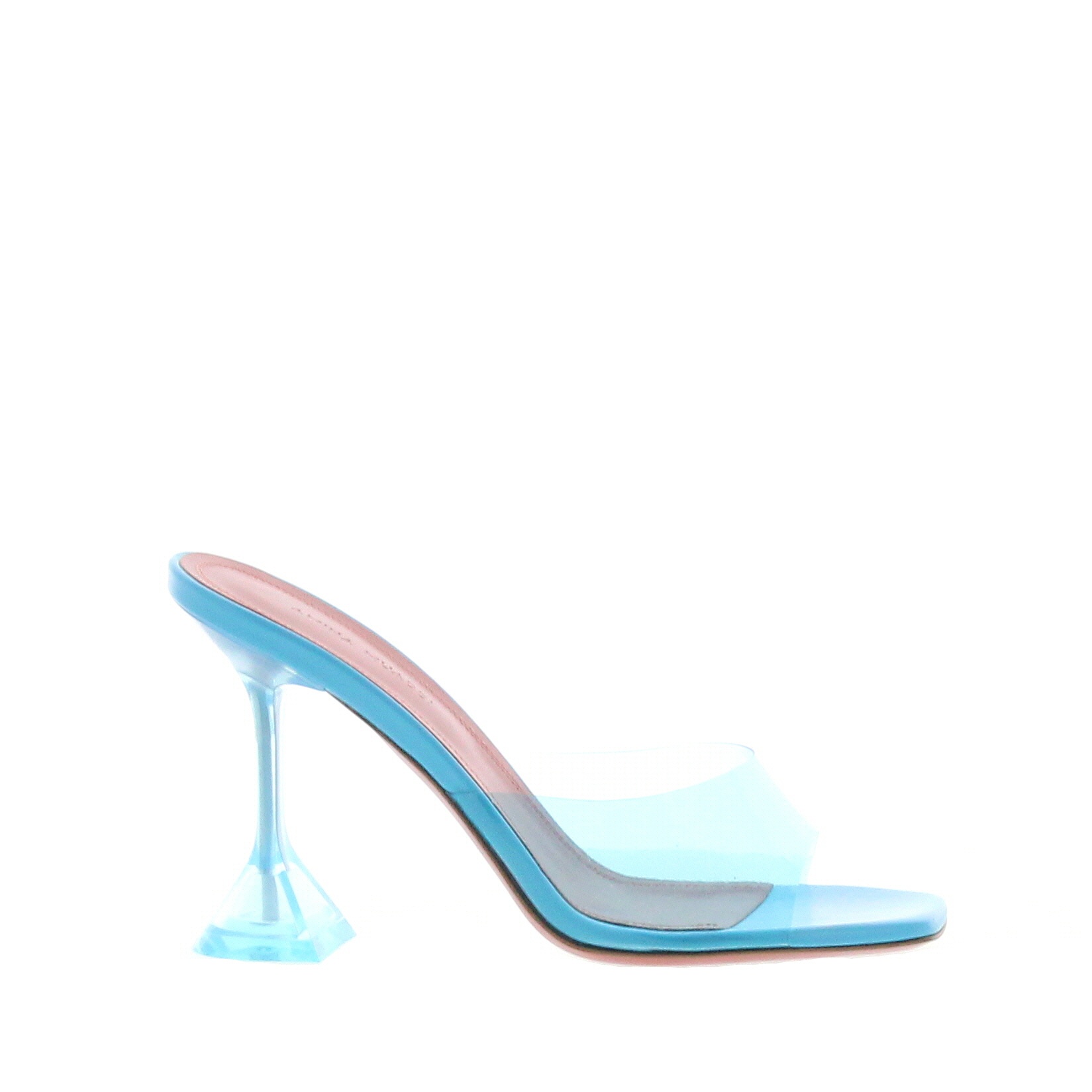 The Lupita slipper is set on the iconic 95mm heel by Amina Muaddi. Crafted in Sky PVC is a very simple mule perfect to wear with any outfit. Made in Italy.