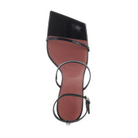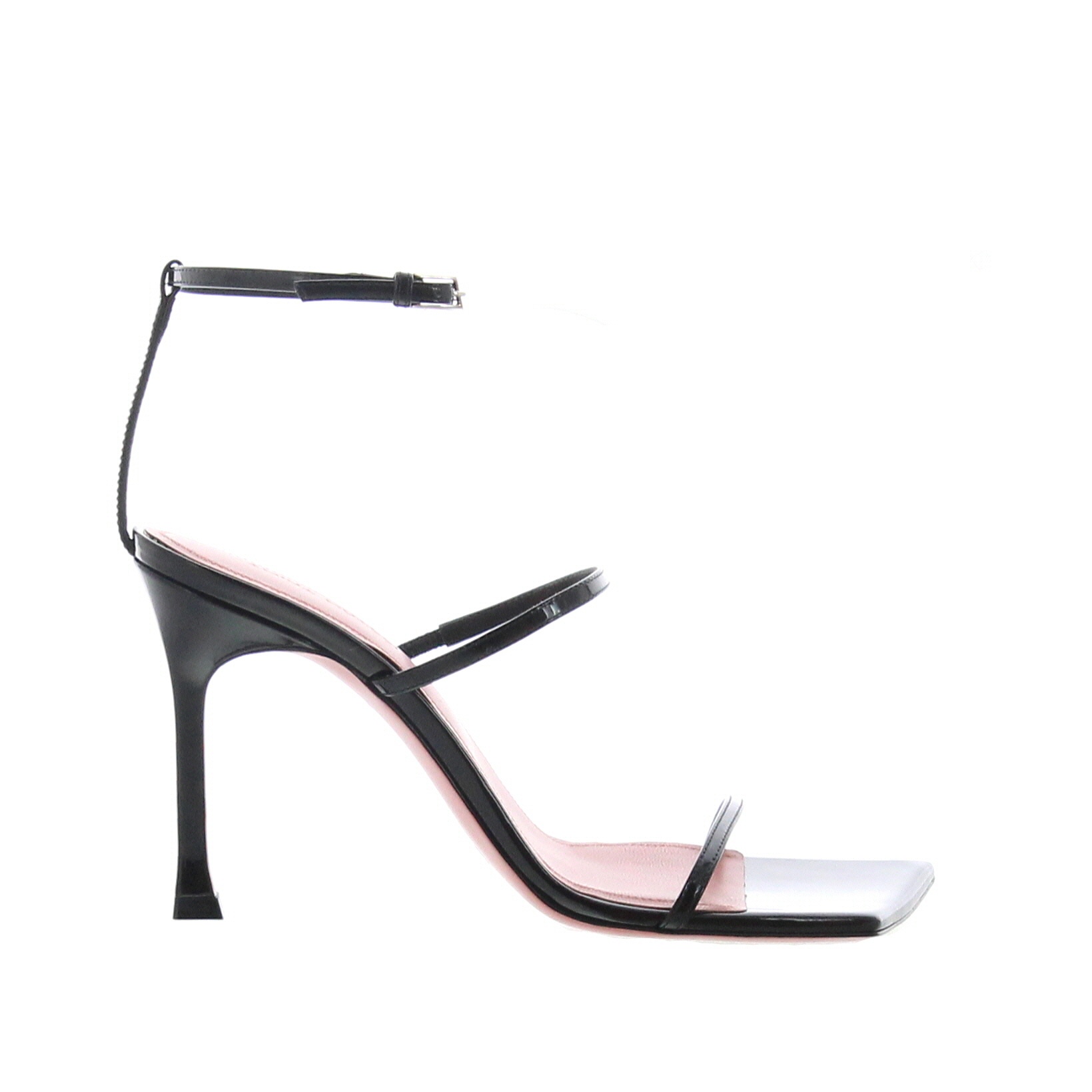 Elegant minimalist sandal with a thin strap on the toes, one on the instep and a third at the ankle with buckle. Crafted in Black Patent leather and set on a 95mm stiletto heel. Leather sole with squared oblique toe. Made in Italy.