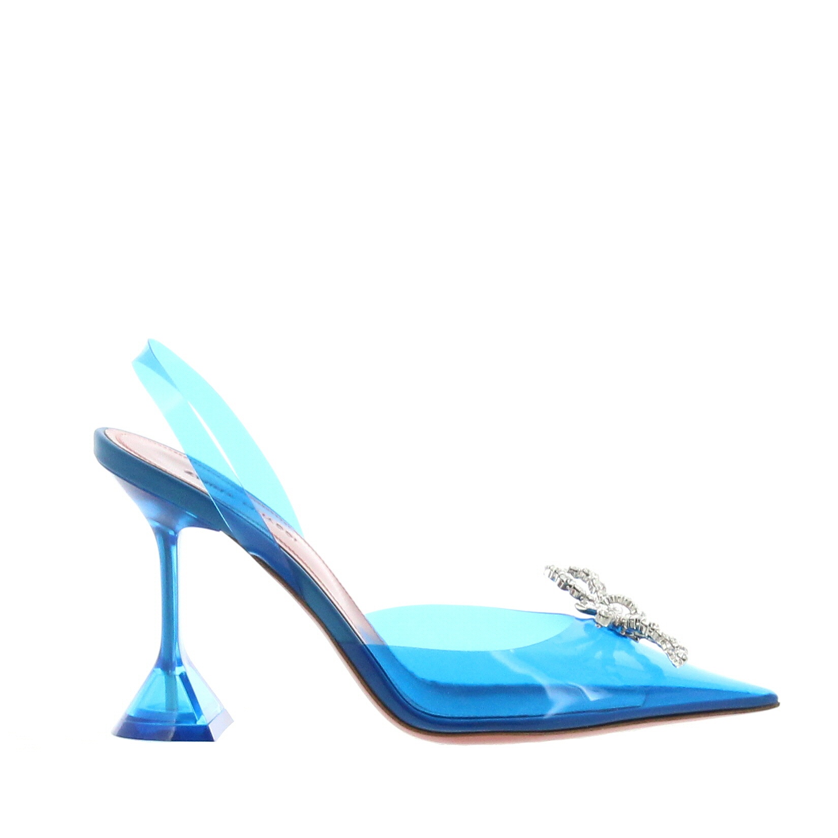 The Rosie Glass slingback is set on the iconic 95mm heel by Amina Muaddi. Crafted in Azur PVC with the signature brooch. Made in Italy.