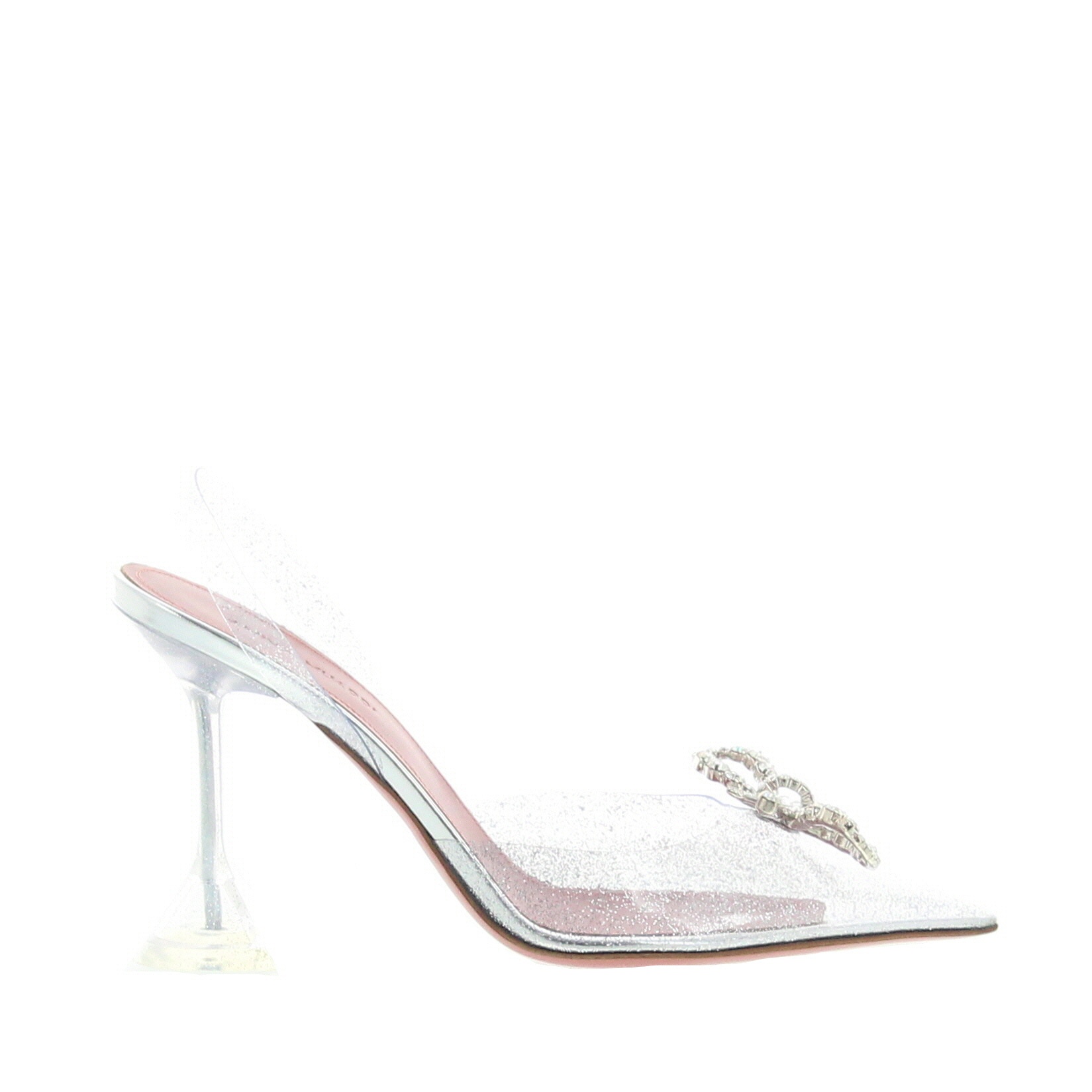 The Rosie Glass slingback is set on the iconic 95mm heel by Amina Muaddi. Crafted in Glitter Silver PVC with the signature brooch. Made in Italy.