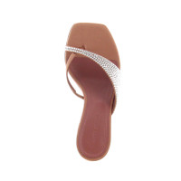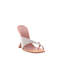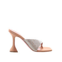 The Shiona slipper is set on the iconic 95mm heel by Amina Muaddi, A band with an asymmetrical shape embellished with white crystals. Crafted in Latte Satin. Made in Italy.