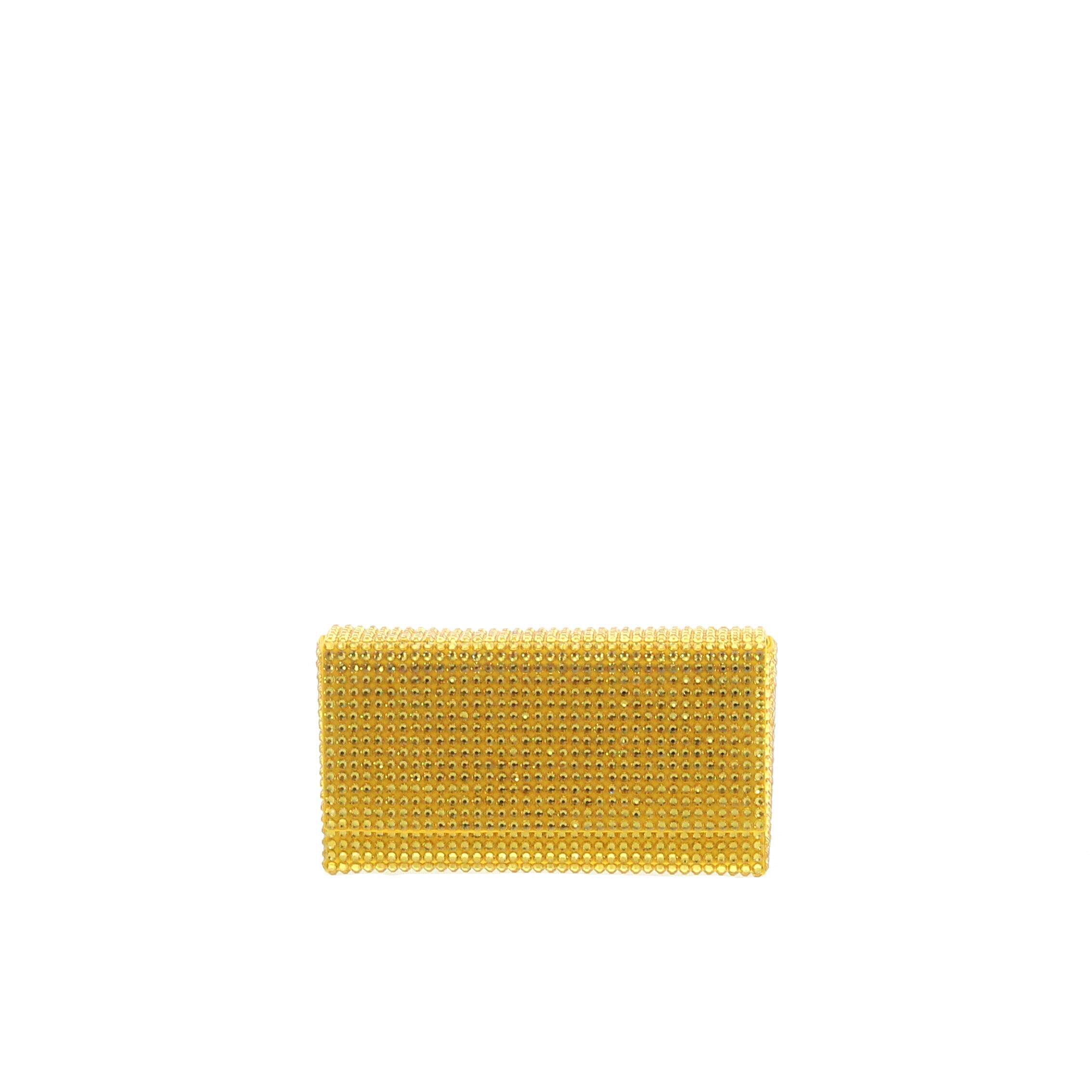Amazing clutch by Amina Muaddi in Golden Yellow Satin embellished with Light Topaz crystals. Dimensions: width 16,5, height 8,5 and depth 3,5cm, silver shoulder chain, drop 49cm. Made in Italy.