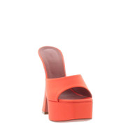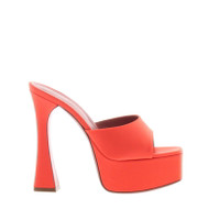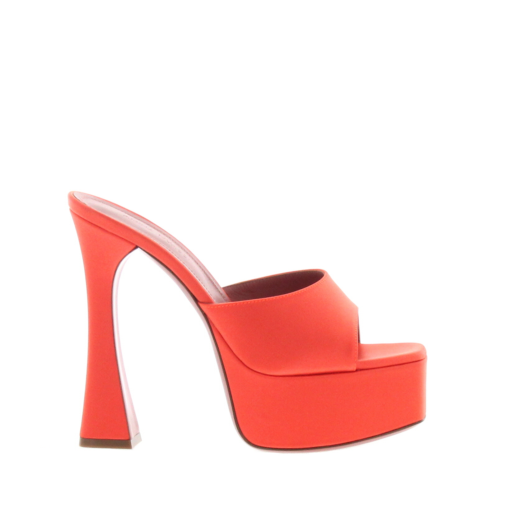 Platform mule with a staggering curved heel, the Dalida sandal has plain band on the toe. Stacked heel of 140mm with 40mm platform. Crafted in Orange Satin, Made in Italy. 695.00 €