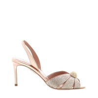Elegant sandal set on a comfortable 75mm stiletto heel. Three leather straps on the toes adorned with rhinestones criss-crossing with a crystal-studded accessory in the centre. Crafted in Petal leather, Leather sole. Made in Italy.