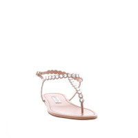 Flat leather T- thong sandal embellished with white crystals. Crafted in Powder Pink calfskin. Leather sole. Made in Italy