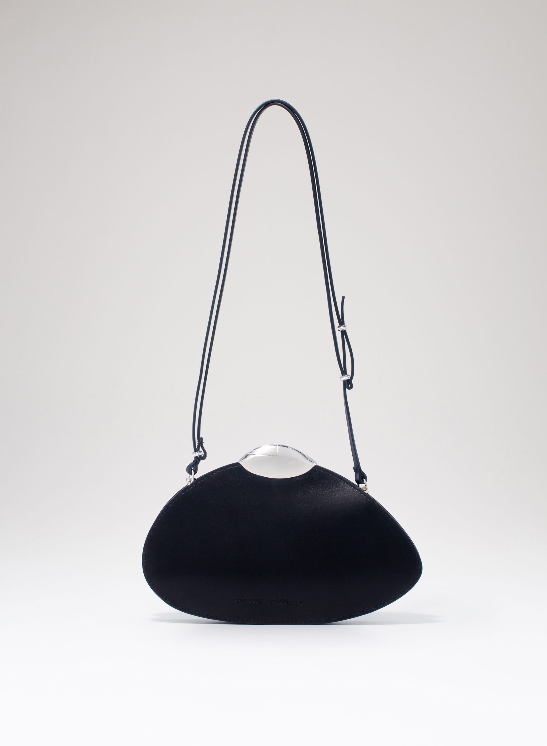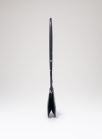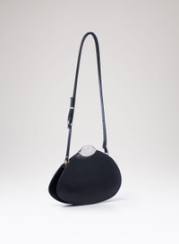 Very light leather bag with two compartments inside. It has a detachable and adjustable shoulder strap and a silver metal clasp. Crafted in Black box calfskin and lined in suede calfskin. Dimensions H15 D5 W25 cm, handle drop length 24/42cm. Made in Italy.