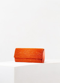 Long clutch with flap, removable shoulder silver chain strap. Crafted in Orange aluminium crystal mesh and silk satin lining. Dimensions H12 D4 W27 cm, chain strap drop 46cm. Made in Italy