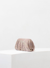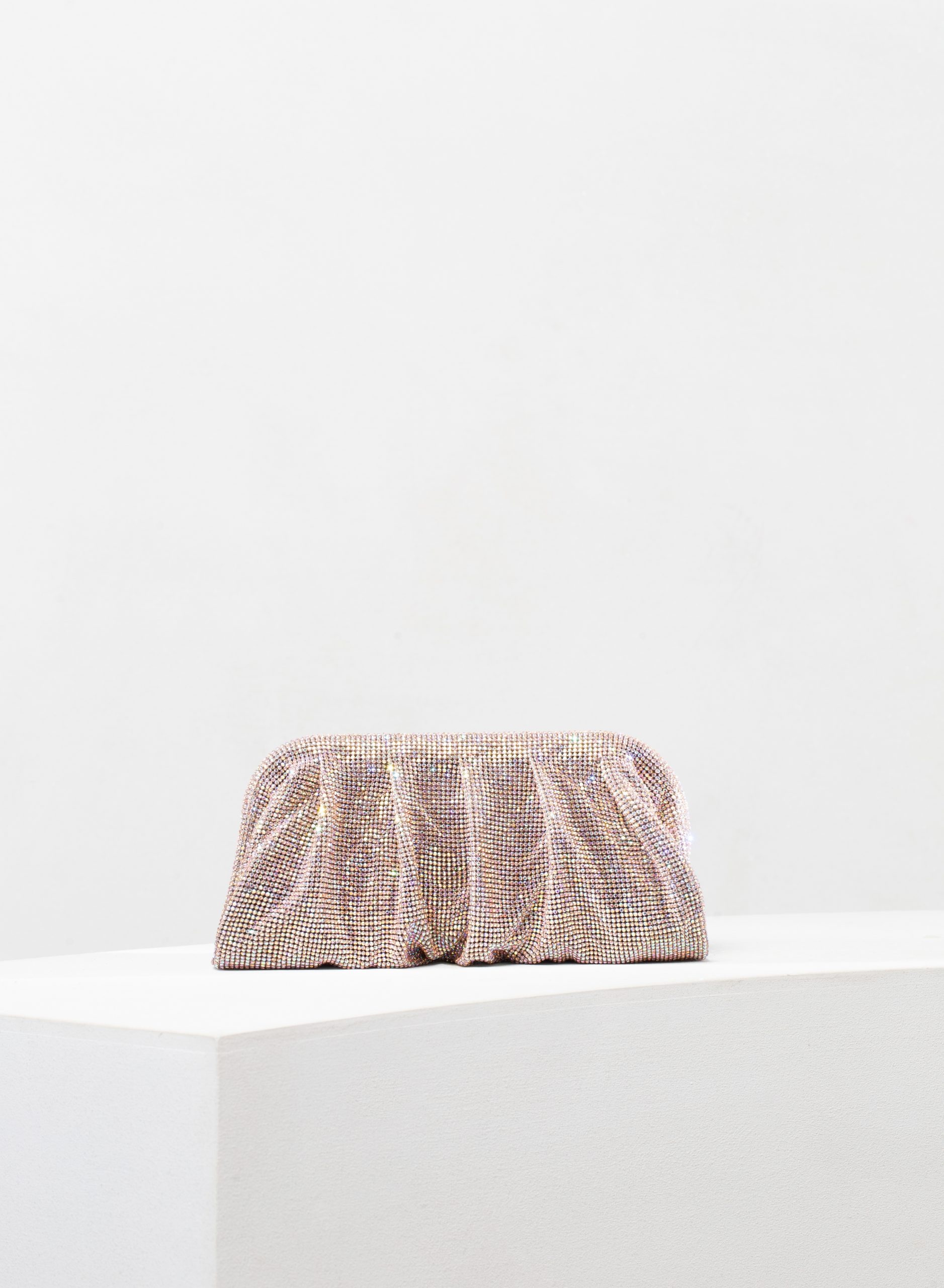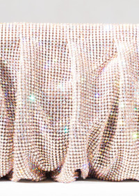A superb clutch with soft and wavy shapes, totally hand stitched in Pink aluminium crystal mesh and silk satin lining. Dimensions H13 D5,5 W32 cm, Made in Italy