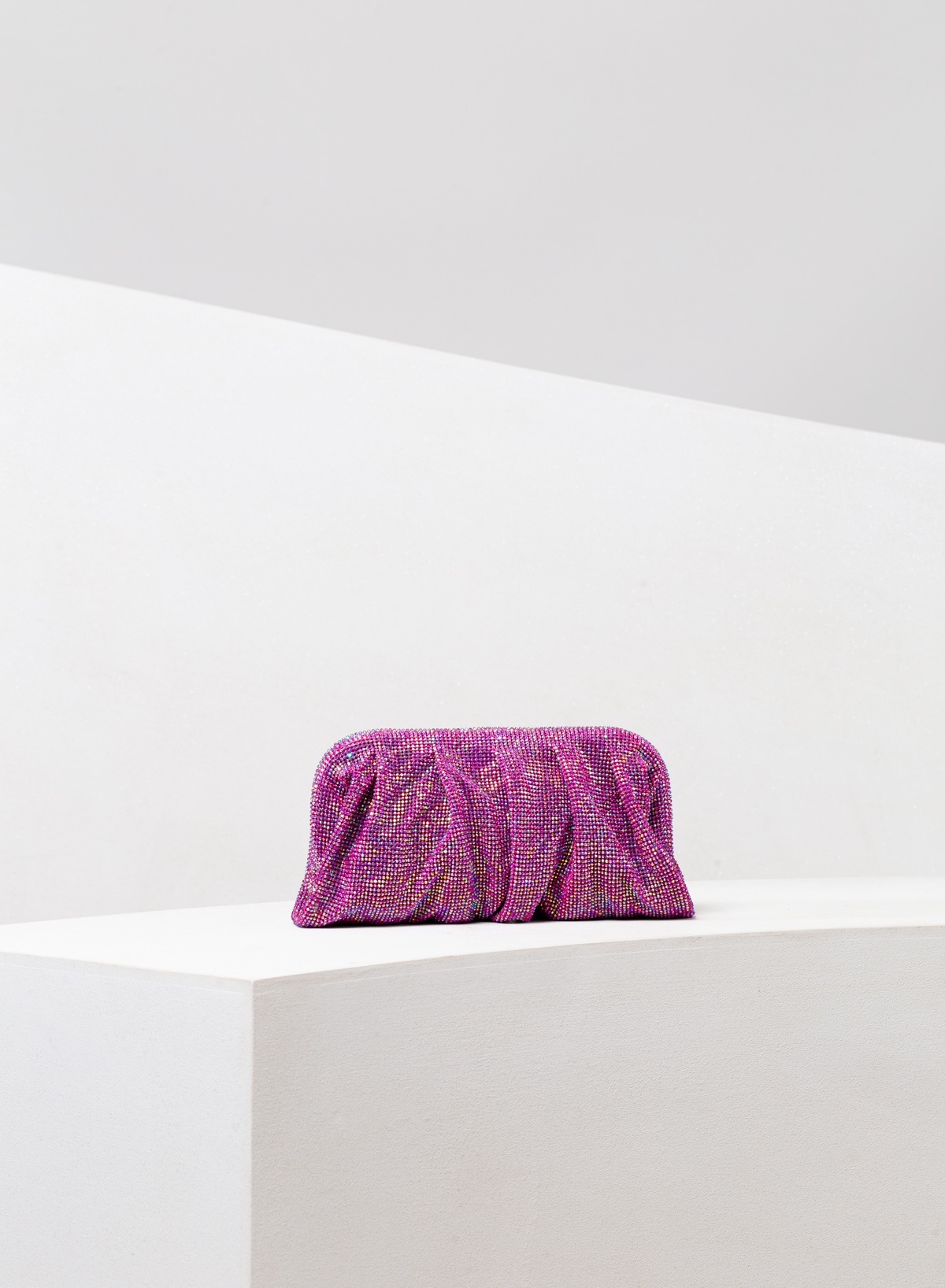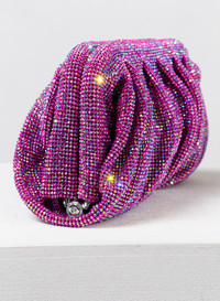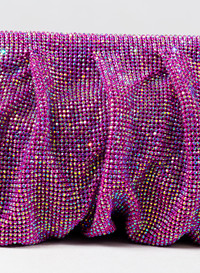 A superb clutch with soft and wavy shapes, totally hand stitched in Fuchsia aluminium crystal mesh and silk satin lining. Dimensions H13 D5,5 W32 cm, Made in Italy