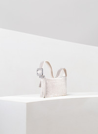 A seductive and fun Mini Bags, totally hand stitched in aluminium crystal mesh and Strawberry silk satin. It swings near the shoulder at every movement of the body. Dimensions H13 D3 W20 cm, Made in Italy