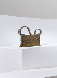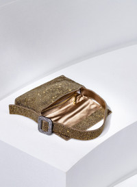 A seductive and fun Mini Bags, totally hand stitched in aluminium crystal mesh and silk satin in Aurum. It swings near the shoulder at every movement of the body. Dimensions H13 D3 W20 cm, Made in Italy
