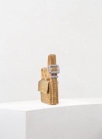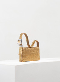 A seductive and fun Mini Bags, totally hand stitched in aluminium crystal mesh and Gold silk satin. It swings near the shoulder at every movement of the body. Dimensions H13 D3 W20 cm, Made in Italy