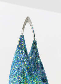 A metal mesh scarf that fits perfectly around a satin case whose zip is accessible on one side. A hanging pocket equipped with a slender metal shoulder strap. Dimensions H37 W22 cm, handle drop 18cm. Made in Italy