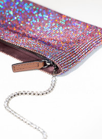Simple flat pouch in Bronze aluminum mesh and crystals with rhinestone chain shoulder strap and zip closure. It swings near the shoulder at every movement of the body. Dimensions H10,5 D2 W19 cm, Strap drop 50cm, Made in Italy
