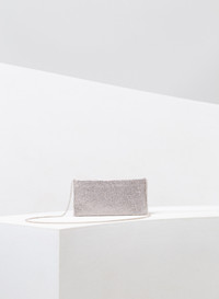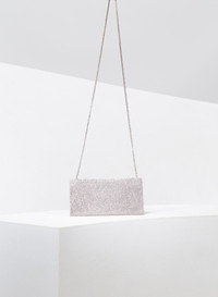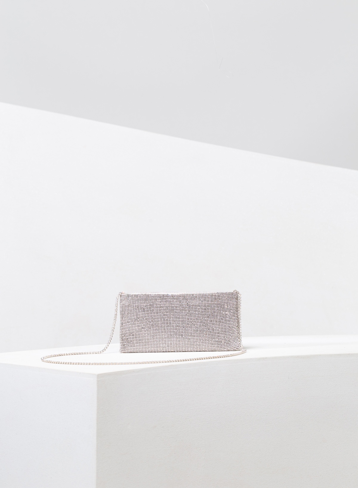 Simple flat pouch in Silver aluminum mesh and crystals with rhinestone chain shoulder strap and zip closure. It swings near the shoulder at every movement of the body. Dimensions H10,5 D2 W19 cm, Strap drop 50cm, Made in Italy