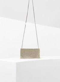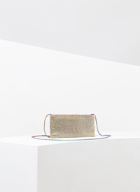 Simple flat pouch in Gold aluminum mesh and crystals with rhinestone chain shoulder strap and zip closure. It swings near the shoulder at every movement of the body. Dimensions H10,5 D2 W19 cm, Strap drop 50cm, Made in Italy