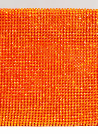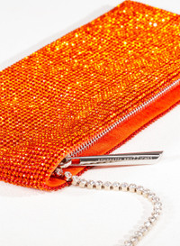 Simple flat pouch in Orange aluminum mesh and crystals with rhinestone chain shoulder strap and zip closure. It swings near the shoulder at every movement of the body. Dimensions H10,5 D2 W19 cm, Strap drop 50cm, Made in Italy