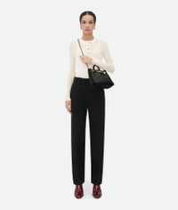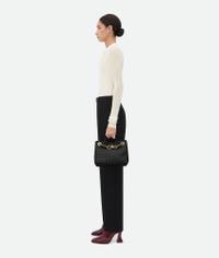 Top handle bag with sliding cross-body chain strap. Crafted in Black lambskin. Compartmented interior with one zipped pocket, two open pockets, magnetic closure. Brass hardware, dimensions Height 20, width 25 and depth 10cm, handle drop 6cm, strap drop 50cm. Made in Italy