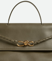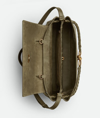 Top handle bag with flap. Sliding shoulder strap and an adjustable/detachable cross-body strap. Features a hidden hook closure, allowing the flap to be closed in the front or attached to the interior Intrecciato pocket. Crafted in Cypress silky calfskin. Brass hardware, dimensions Height 32cm | 12.6", width 41.5cm | 16.3" and depth 14.5cm | 5.7", handle drop 11cm | 4.3, strap drop 45cm | 17.7". Made in Italy.