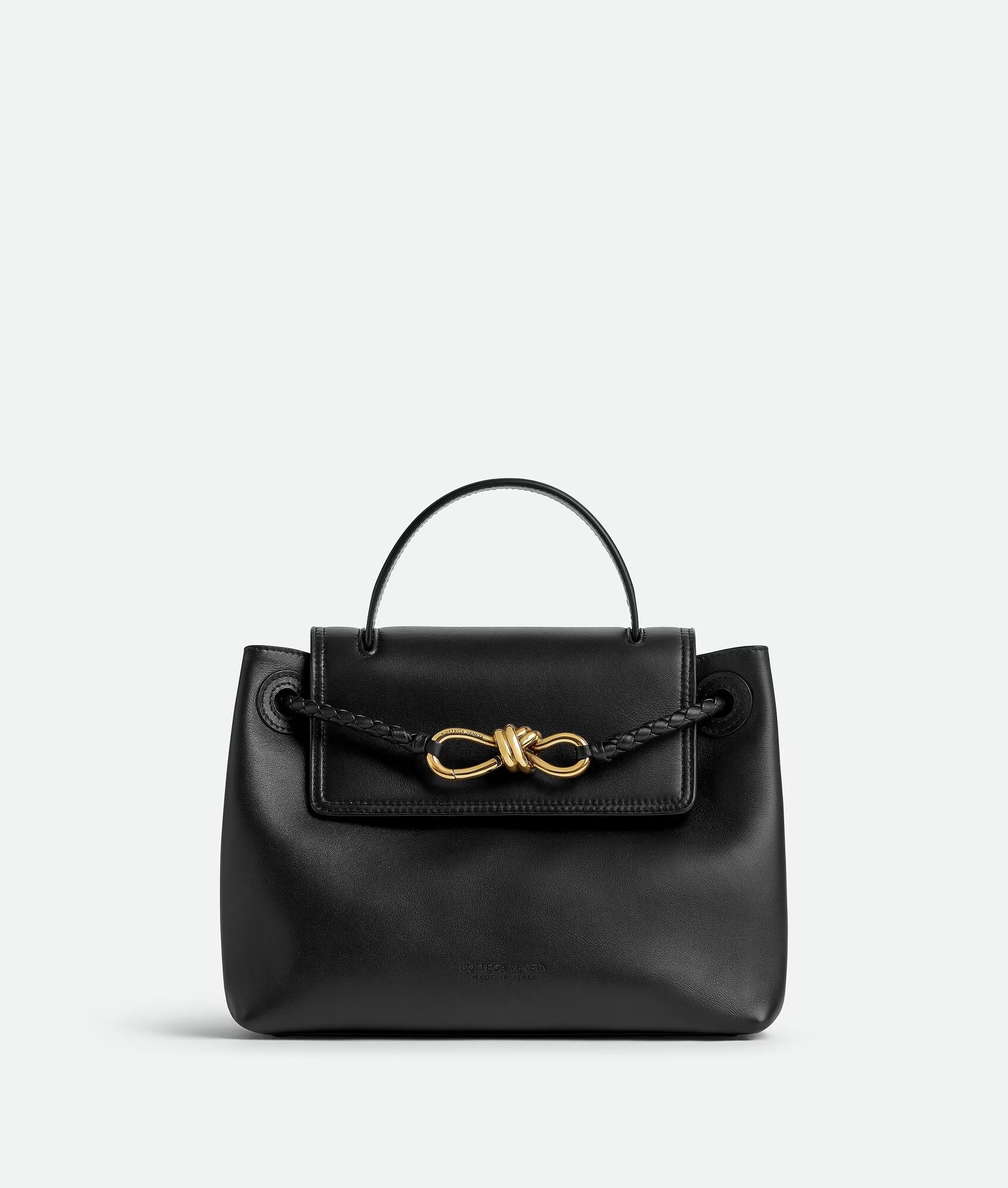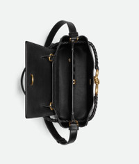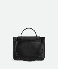 Top handle bag with flap. Sliding shoulder strap and an adjustable/detachable cross-body strap. Features a hidden hook closure, allowing the flap to be closed in the front or attached to the interior Intrecciato pocket. Crafted in Black silky calfskin. Brass hardware, dimensions Height 19cm | 7.5", width 26cm | 10.2" and depth 10.5cm | 4.1", handle drop 7.5cm | 3", strap drop 55cm | 21.7". Made in Italy.