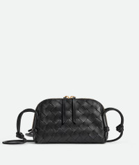 Woven nappa leather bag with adjustable shoulder strap and zipper closure. Single compartment with flat pocket inside. Adjustable leather tubular strap with sliding knots. Crafted in Black calfskin and lambskin with Gold hardware. • Height: 11.5 cm | 4.5" • Width: 18.5 cm | 7.9" • Depth: 8.5 cm | 3.3” Made in Italy
